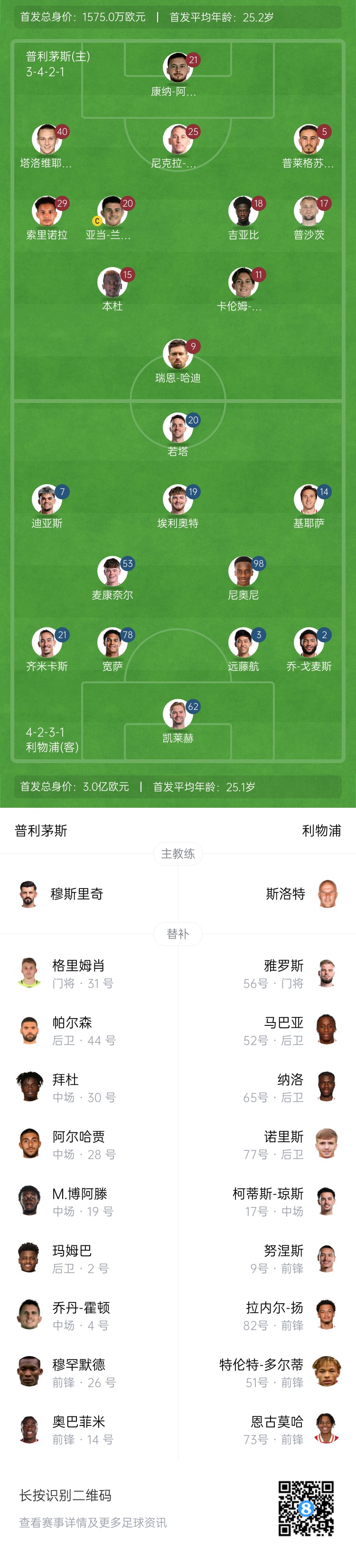 利物浦首發(fā):62-凱萊赫、2-喬-戈麥斯、21-齊米卡斯、53-麥康奈爾、78-寬薩、3-遠藤航、19-埃利奧特、98-尼奧尼、7-路易斯-迪亞斯、14-基耶薩、20-若塔