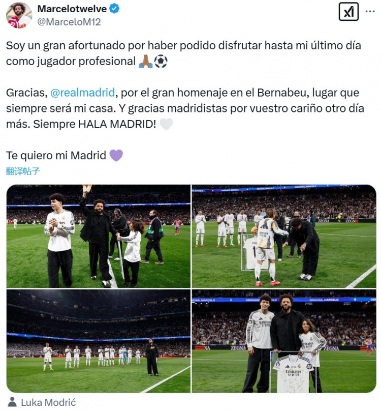 馬塞洛上傳了告別儀式的照片,并配文寫道:“我很幸運能享受作為職業(yè)球員的最后一天,感謝皇家馬德里,感謝你們在伯納烏球場的盛大儀式,這里永遠是我的家?!?/span>