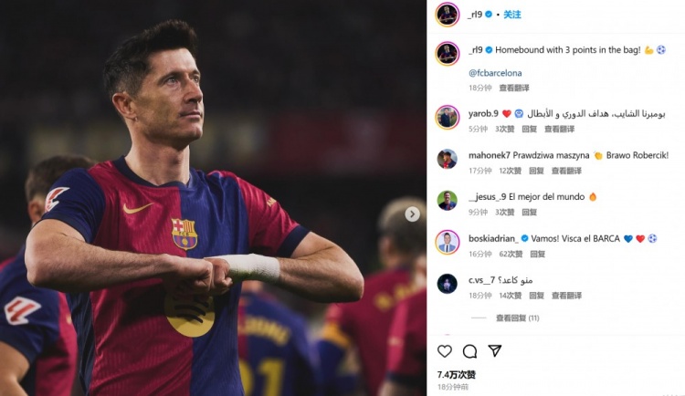 萊萬也在賽后通過社媒曬出自己的慶祝照,并配文:“包里揣著3分回家@巴薩俱樂部”。