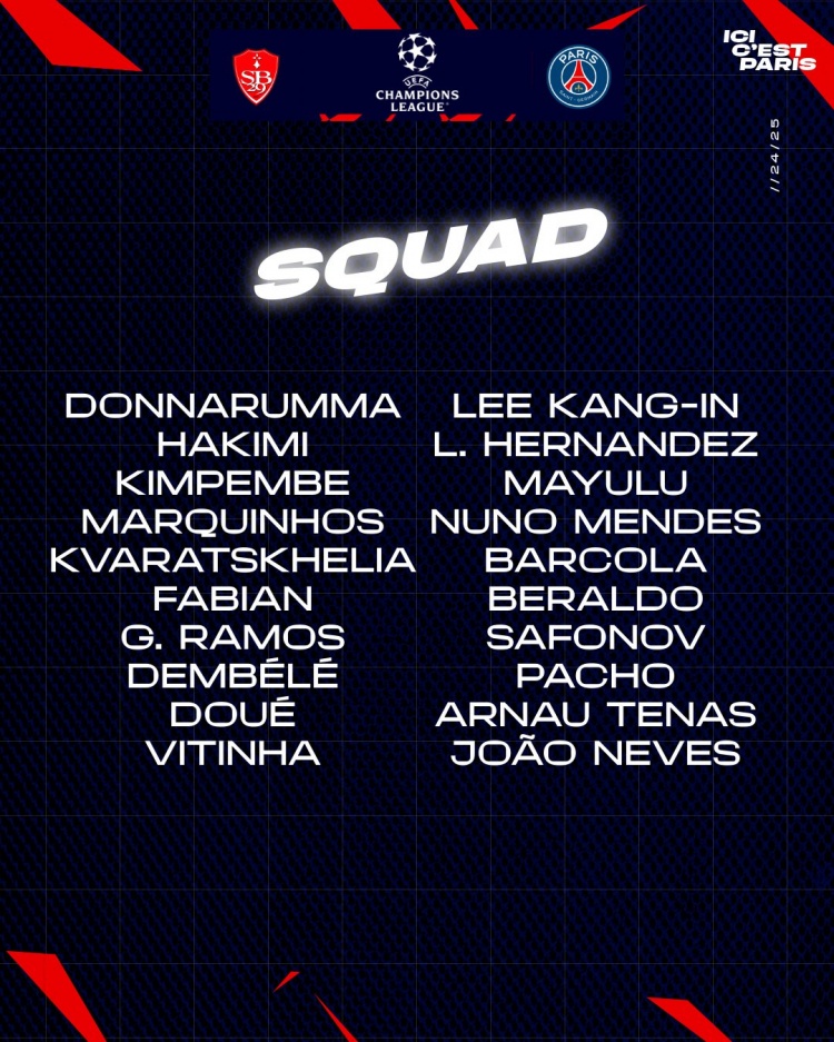 2月10日訊 北京時(shí)間2月12日凌晨,巴黎將在歐冠淘汰賽附加賽首回合比賽中客場(chǎng)對(duì)陣布雷斯特,巴黎公布了此役的球員名單,登貝萊、克瓦拉茨赫利亞、若昂-內(nèi)維斯在列,扎伊爾-埃梅里繼續(xù)缺席。