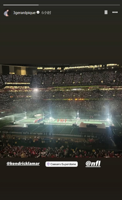 阿爾巴賽前更新社媒曬出與梅西、蘇牙、布斯克茨合照。美國(guó)嘻哈巨星肯德里克-拉馬爾帶來(lái)超級(jí)碗中場(chǎng)秀時(shí),皮克曬照也在現(xiàn)場(chǎng)。