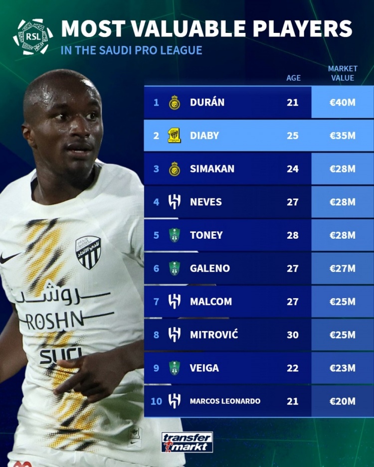 沙特聯(lián)賽球員德轉(zhuǎn)身價(jià)排名: