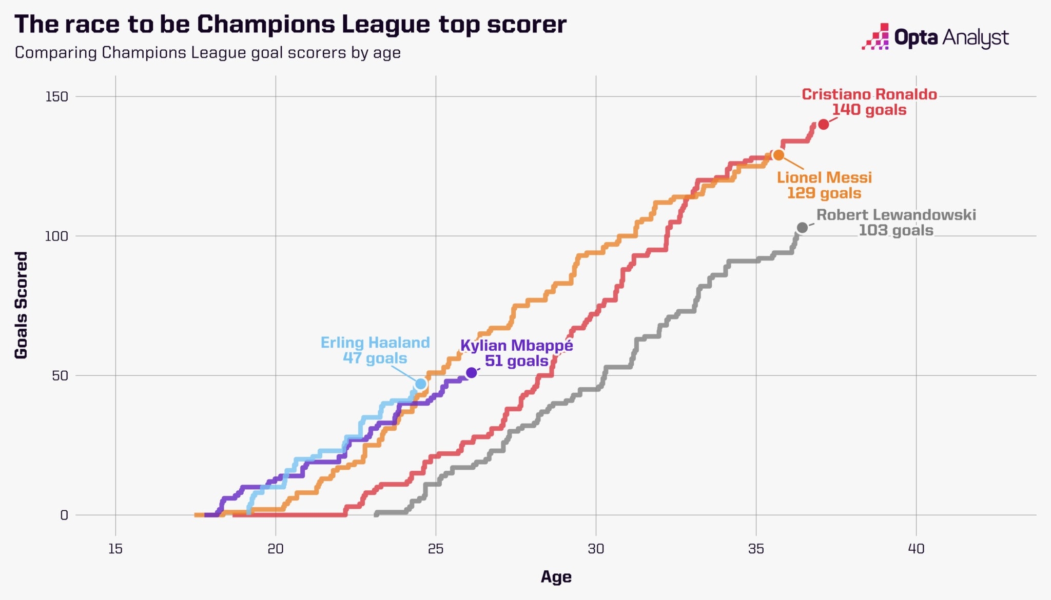 姆巴佩(紫)、哈蘭德(藍(lán))在歐冠的進(jìn)球效率,與C羅(紅)、梅西(黃)、萊萬(wàn)(灰)三大射手的對(duì)比橫軸為年齡,縱軸為歐冠進(jìn)球數(shù) 標(biāo)簽: 足球 西甲 皇家馬德里 英超 曼城 C羅 梅西 萊萬(wàn) 歐冠