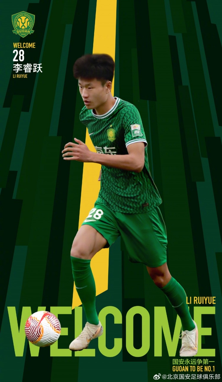 李睿躍正式加盟北京國安足球俱樂部,他將身披28號球衣,代表北京國安出戰(zhàn)本賽季中超聯(lián)賽、亞冠聯(lián)賽、足協(xié)杯等各項賽事。 李睿躍出生于2006年5月15日,身高192cm,體重79kg,司職中場。