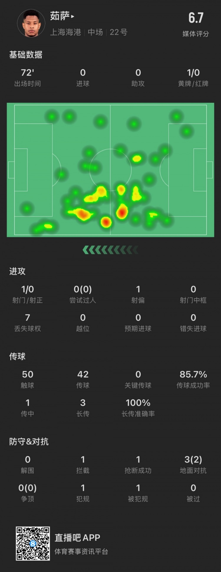 觸球50次,傳球42次,傳球成功率85.7%