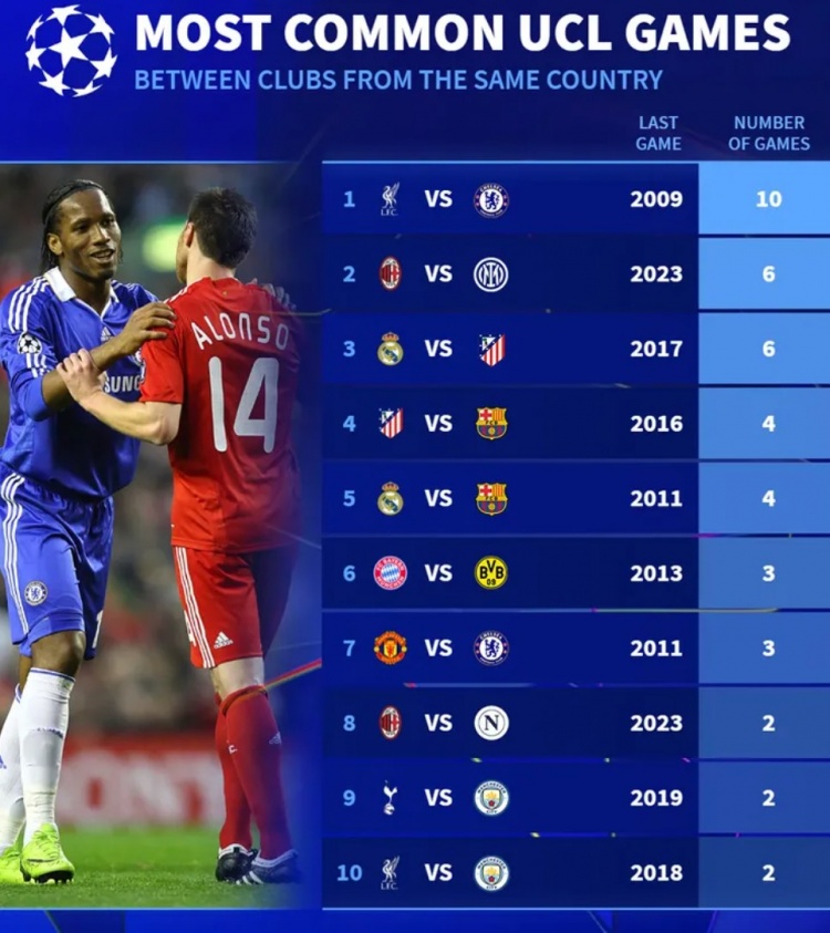 歐冠同國德比榜:利物浦vs切爾西10次居首,米蘭&馬德里德比各6次