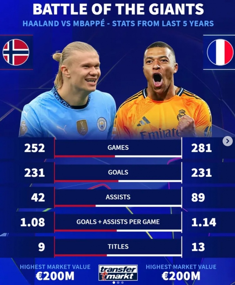 2月12日訊 皇馬和曼城即將迎來(lái)歐冠淘汰賽附加賽,《轉(zhuǎn)會(huì)市場(chǎng)》也列出了姆巴佩和哈蘭德近5年的關(guān)鍵數(shù)據(jù)對(duì)比: