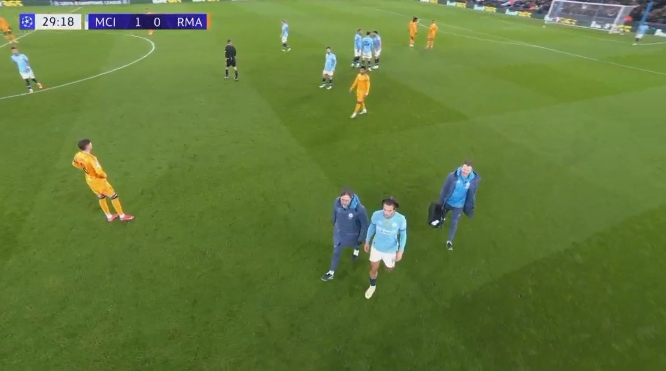 02月12日訊 曼城vs皇馬第30分鐘,格拉利什蹲在場上無法堅持了!隨即曼城調(diào)整,格拉利什下福登上!