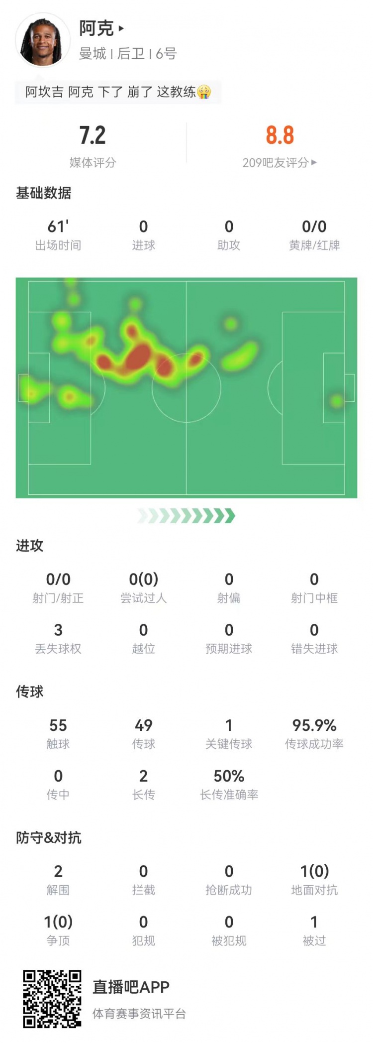 2月12日訊 曼城在本輪歐冠2-3被皇馬逆轉(zhuǎn),阿克本場數(shù)據(jù)如下: