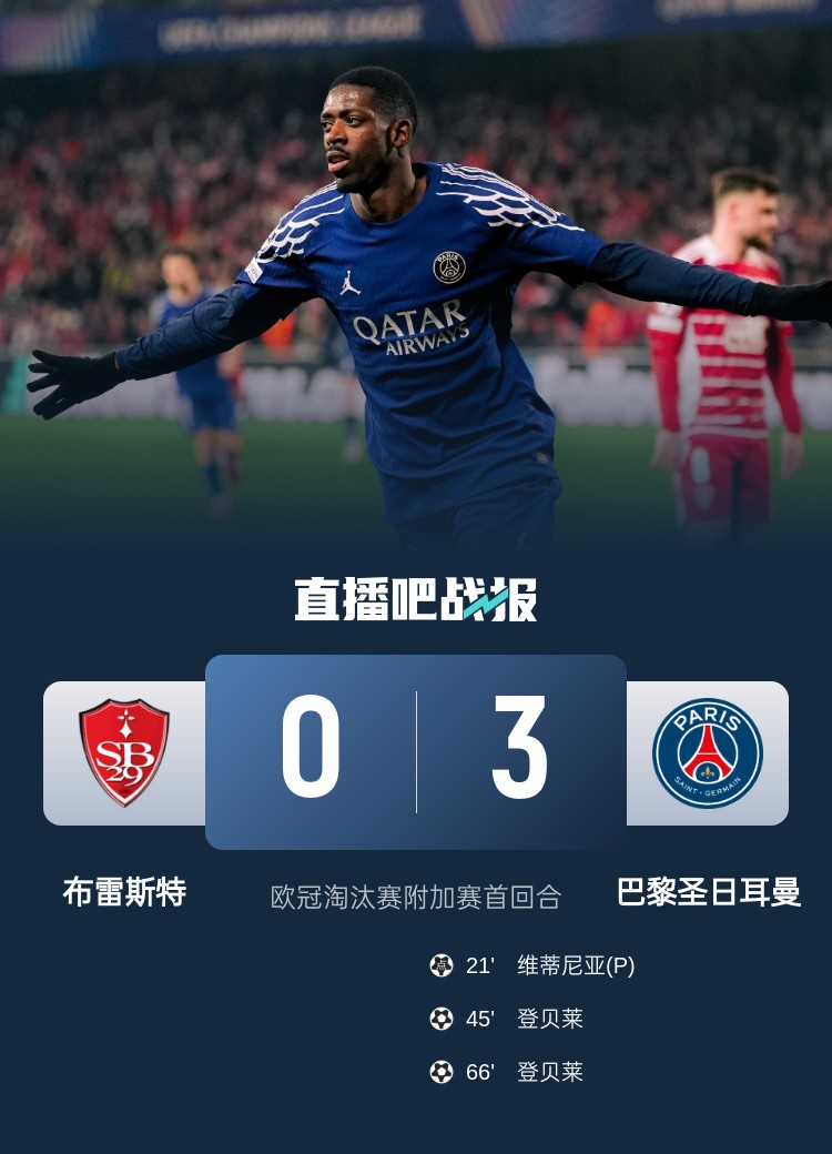 登貝萊梅開二度+造點(diǎn),巴黎3-0布雷斯特取得先機(jī)。