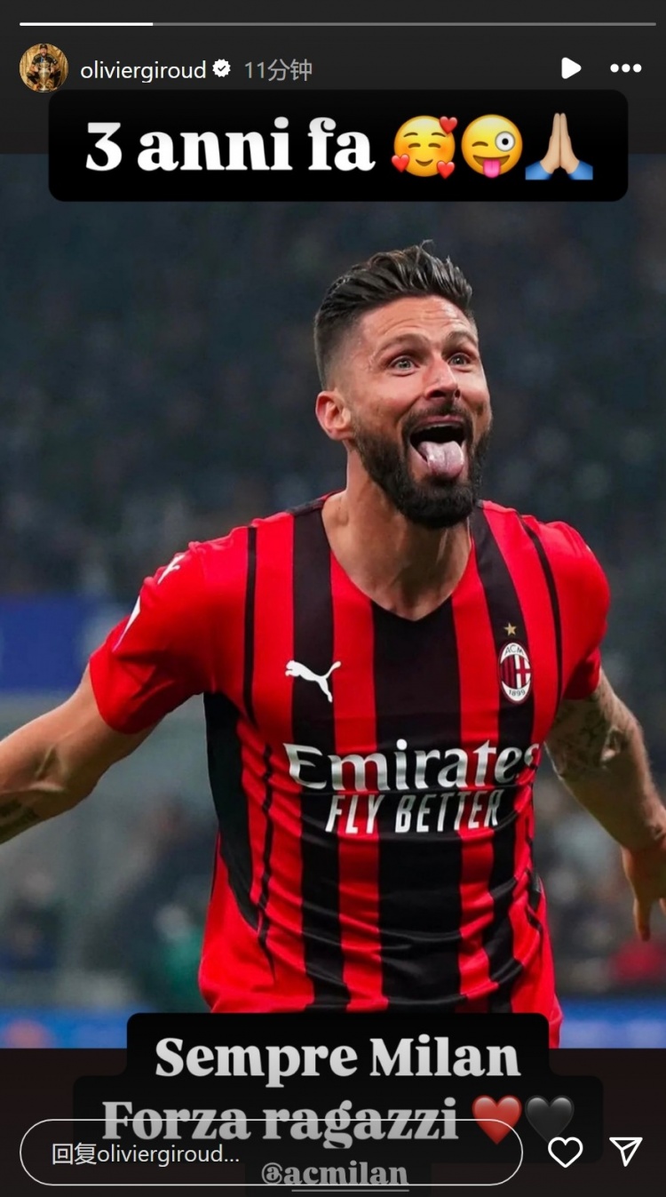 吉魯在社交媒體上曬出自己當時慶祝進球的照片,配文:“三年前。永恒的米蘭,加油兄弟們!”