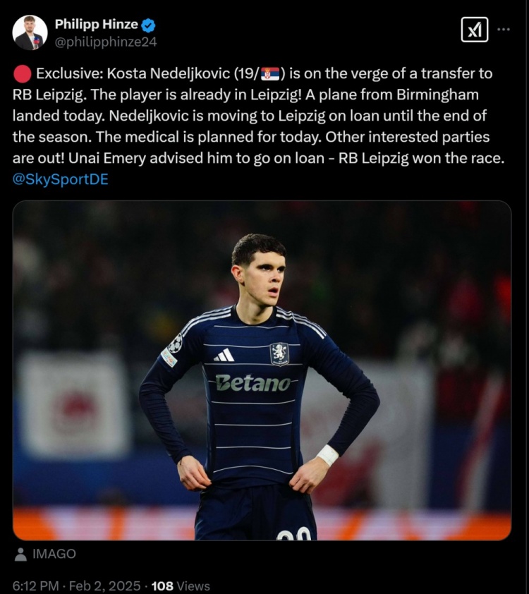 目前,球員已經(jīng)乘坐飛機從伯明翰抵達了萊比錫。內(nèi)德伊科維奇將以租借形式加盟萊比錫,直到本賽季結(jié)束。球員的體檢計劃在今天進行。維拉主帥埃梅里建議這名小將外租鍛煉,現(xiàn)在?萊比錫贏下了球員爭奪戰(zhàn)。