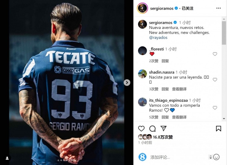 拉莫斯社媒曬出身穿蒙特雷93號球衣的背影照片,配文:“新的冒險,新的挑戰(zhàn)?!?/p>