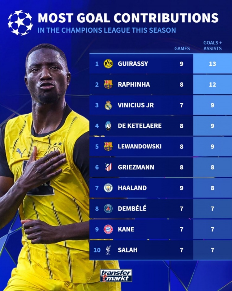 2月12日訊 德國轉(zhuǎn)會市場統(tǒng)計了本賽季球員在歐冠比賽中參與進球的數(shù)量,并列出榜單,吉拉西參與13球居首,拉菲尼亞參與12球次席。