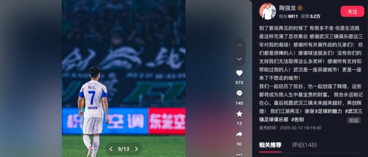 2月12日訊 陶強龍更新社媒,告別武漢三鎮(zhèn)俱樂部。