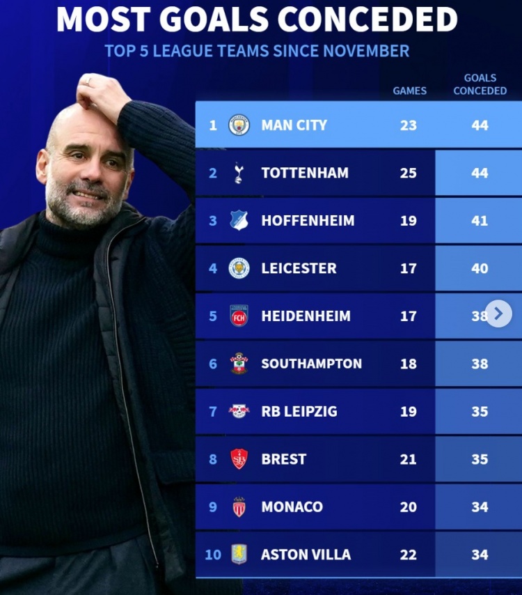 2月13日訊 曼城在本輪歐冠附加賽首回合2-3被皇馬逆轉(zhuǎn),防線延續(xù)了近期低迷表現(xiàn),《轉(zhuǎn)會市場》統(tǒng)計(jì)顯示曼城自11月以來丟球數(shù)是五大聯(lián)賽球隊(duì)最多。