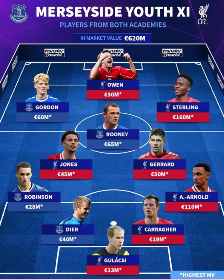 2月13日訊 利物浦將在本輪英超迎來(lái)同埃弗頓的默西賽德郡德比,《轉(zhuǎn)會(huì)市場(chǎng)》也列出了兩隊(duì)歷史最貴身價(jià)青訓(xùn)陣容。