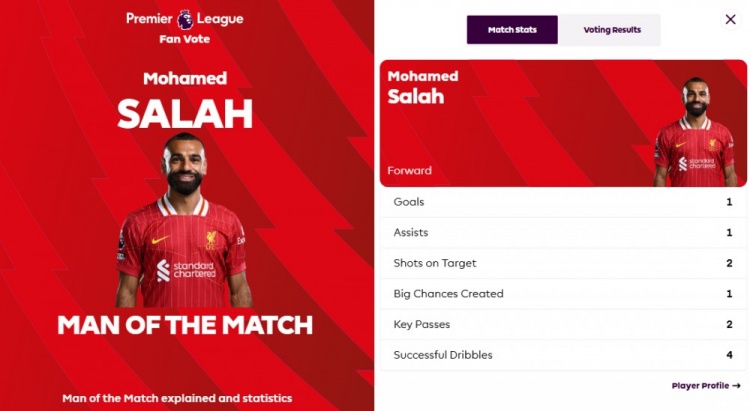 全場比賽,薩拉赫2次射正,打進1球,送出1次助攻,他還創(chuàng)造了1次重要的進球機會,送出2次關鍵傳球,4次過人成功。