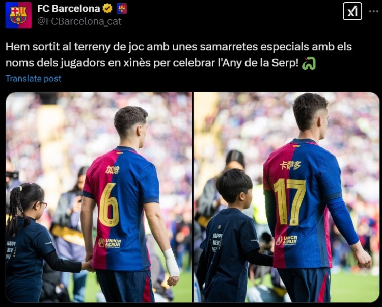 巴薩球員在入場的時候身穿帶有中文名字的球衣入場,以此慶祝中國蛇年新春佳節(jié)。