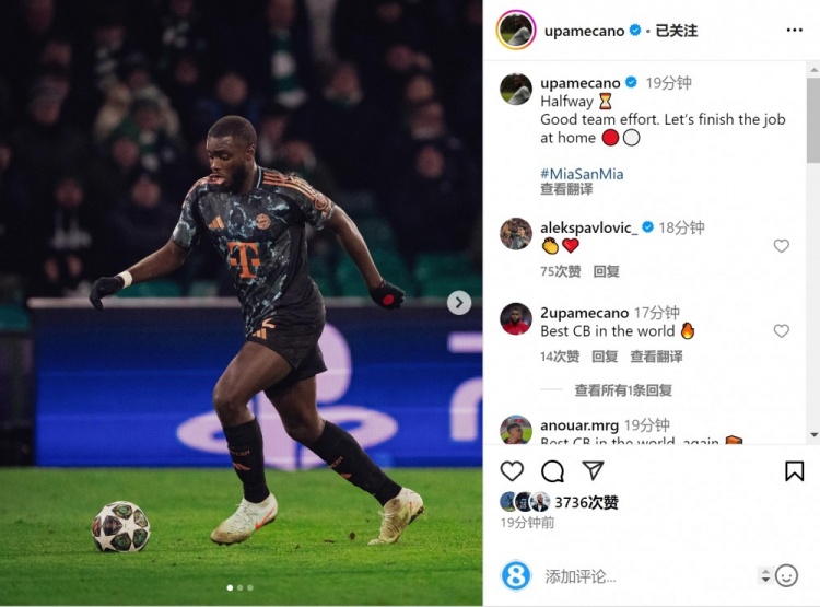 2月13日訊 歐冠淘汰賽附加賽首回合比賽,拜仁客場(chǎng)2-1擊敗凱爾特人,拜仁中衛(wèi)于帕梅卡諾當(dāng)選全場(chǎng)最佳球員。