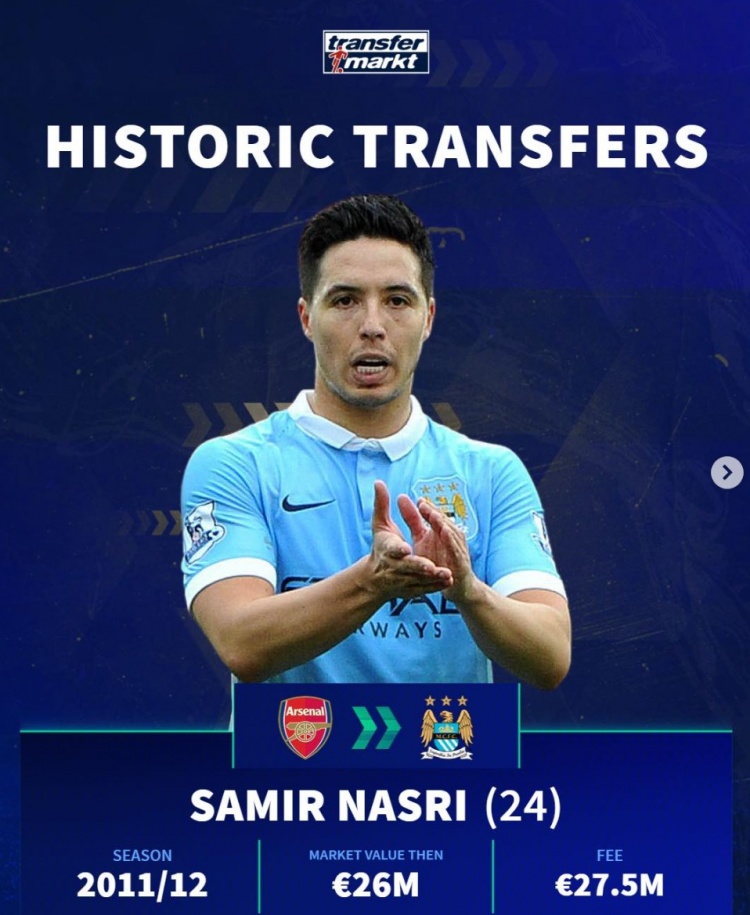 納斯里(阿森納→曼城):11-12賽季,24歲,身價2600萬歐,轉(zhuǎn)會費(fèi)2750萬歐