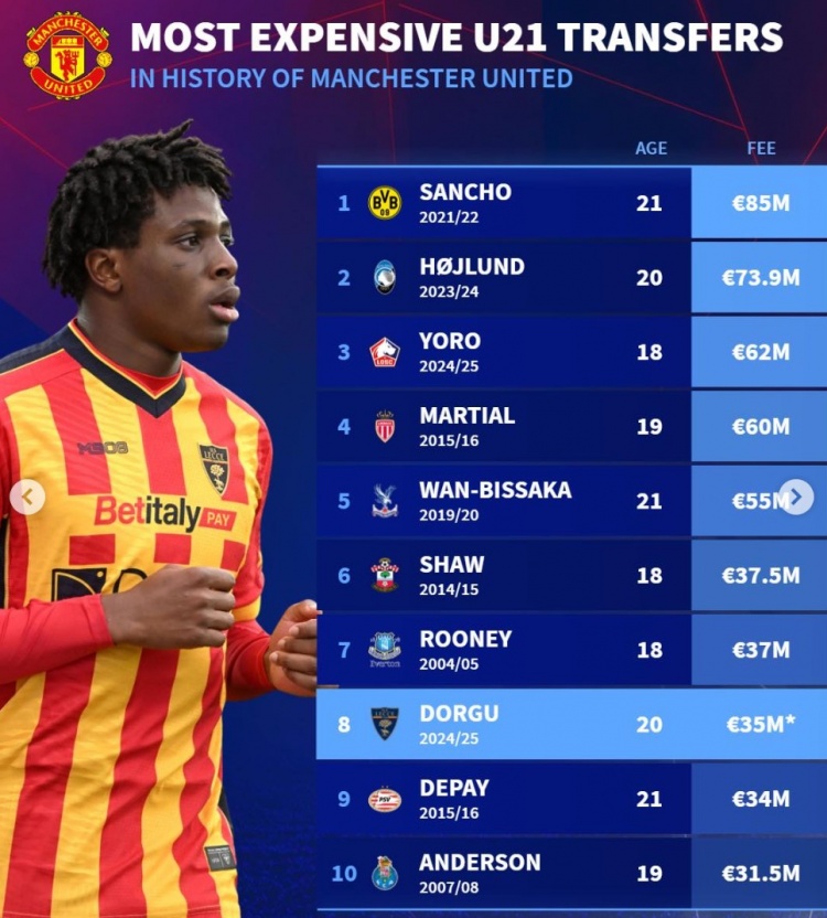 2月2日訊 曼聯(lián)已經(jīng)官宣從萊切引進(jìn)翼衛(wèi)多古,《轉(zhuǎn)會(huì)市場(chǎng)》也統(tǒng)計(jì)了曼聯(lián)隊(duì)史U21球員引援榜。