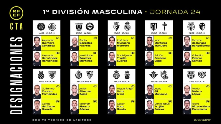 2月13日訊 西班牙足協(xié)今日公布了西甲第24輪各場(chǎng)比賽的裁判安排,具體如下: