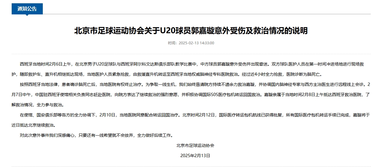 北京市足球運(yùn)動協(xié)會關(guān)于U20球員郭嘉璇意外受傷及救治情況的說明