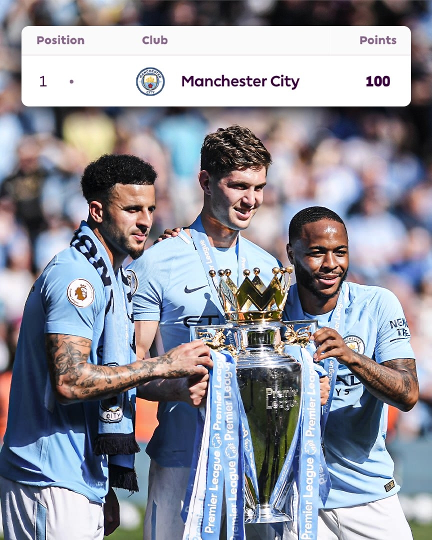 2017-18賽季,瓜迪奧拉率領曼城奪得英超冠軍,38輪比賽32勝4平2負積100分,創(chuàng)下英超單賽季積分紀錄,并一直保持到現(xiàn)在。