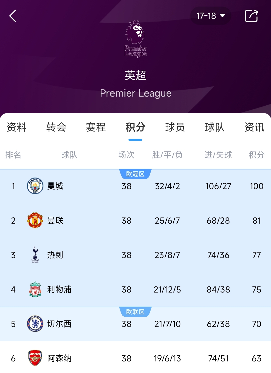 2017/18賽季英超積分榜