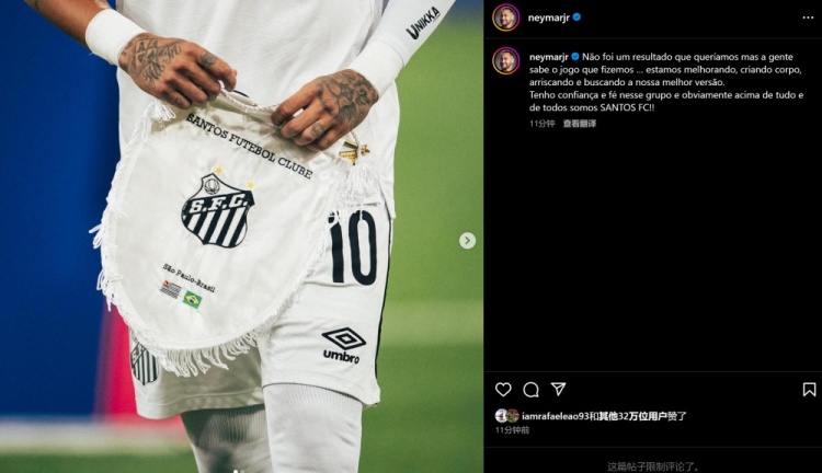 2月13日訊 巴西圣保羅州錦標賽第9輪,桑托斯客場1-2不敵科林蒂安,內馬爾出戰(zhàn)68分鐘。賽后,他更新了社媒,為球隊鼓舞士氣。