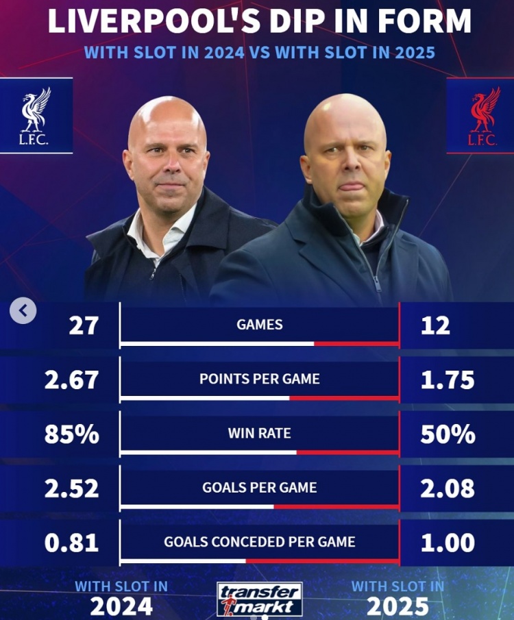 2月14日訊 利物浦在本輪英超2-2被埃弗頓絕平,《轉(zhuǎn)會(huì)市場(chǎng)》也對(duì)比了斯洛特帶領(lǐng)利物浦在去年和今年的戰(zhàn)績(jī)情況。