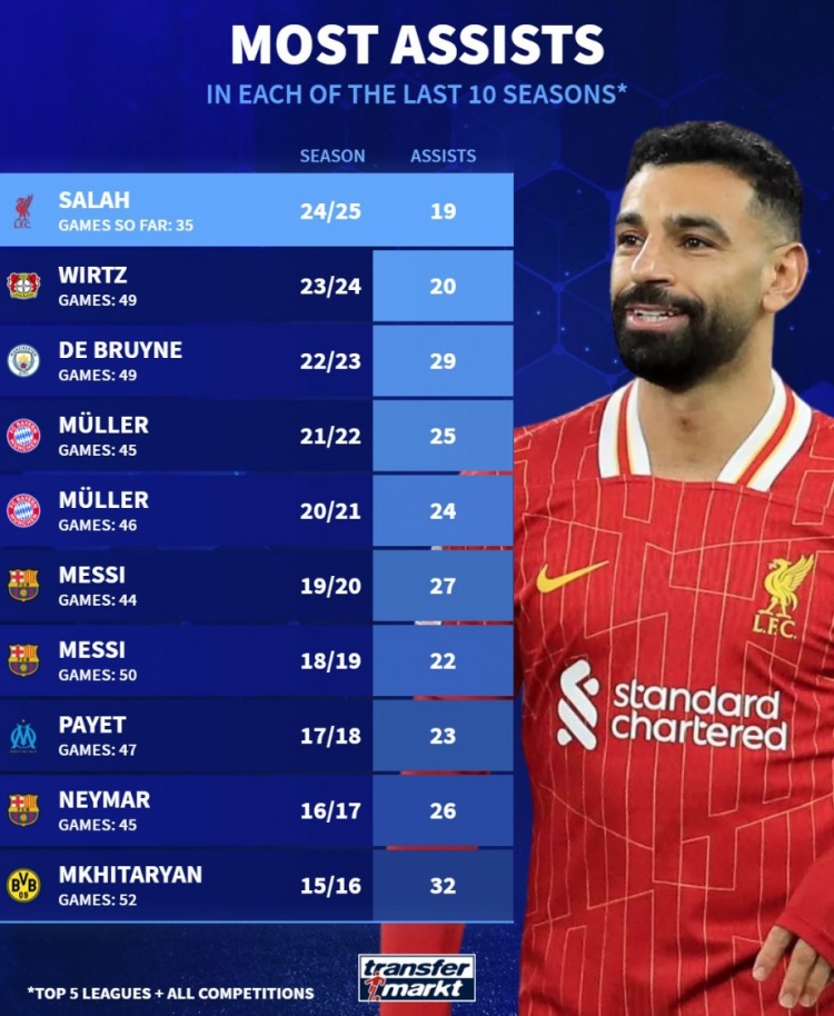 2月14日訊 薩拉赫在本賽季以19次助攻領(lǐng)跑五大聯(lián)賽各項賽事總助攻榜,《轉(zhuǎn)會市場》也列出了近10賽季的總助攻王情況。