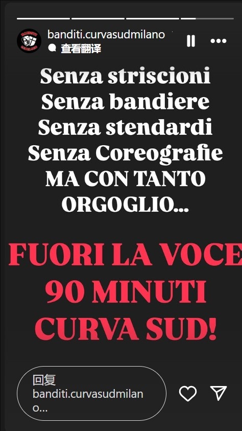 在早些時(shí)候有媒體報(bào)道稱,米蘭南看臺(tái)死忠球迷組織將會(huì)在米蘭德比中用沉默來(lái)抗議俱樂(lè)部高層,將不會(huì)在比賽中以任何形式支持米蘭。