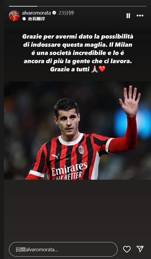 莫拉塔寫道:“感謝你們給我穿上這件球衣的機(jī)會,米蘭是一支無與倫比的俱樂部,在這里工作的人們則更加美妙,感謝大家?!?/p>