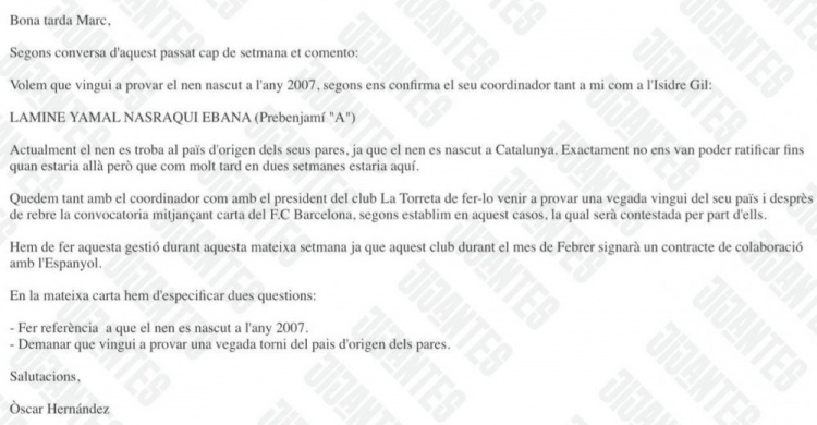2015年,奧斯卡-埃爾南德斯(不是哈維的弟弟,同名)當(dāng)時擔(dān)任巴薩青訓(xùn)幼兒組協(xié)調(diào)員。在近日接受Jijantes采訪時,奧斯卡-埃爾南德斯披露了一份郵件,亞馬爾7歲時曾很有可能加入西班牙人。