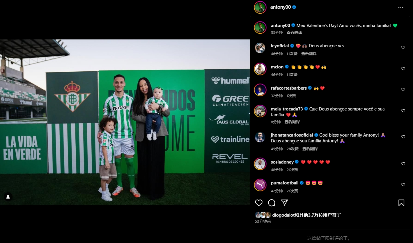 貝蒂斯邊鋒安東尼在社媒曬出了自己與家人們的合照,配文道:屬于我的情人節(jié)!我愛你們我的家人!
