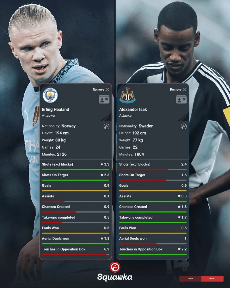 2月15日訊 本周英超第25輪,曼城主場對陣紐卡。Squawka對比了哈蘭德和伊薩克本賽季英超的數(shù)據(jù)。