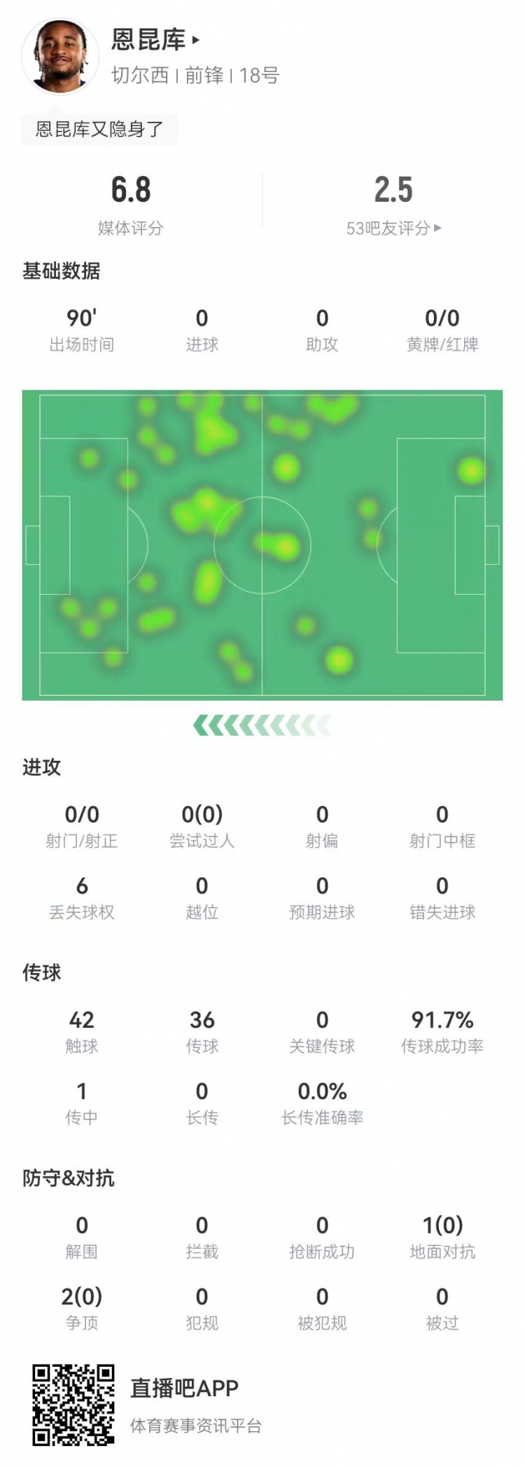 踢得了中鋒嗎?!恩昆庫(kù)本場(chǎng)0射門(mén)0關(guān)鍵傳球0過(guò)人 3對(duì)抗0成功