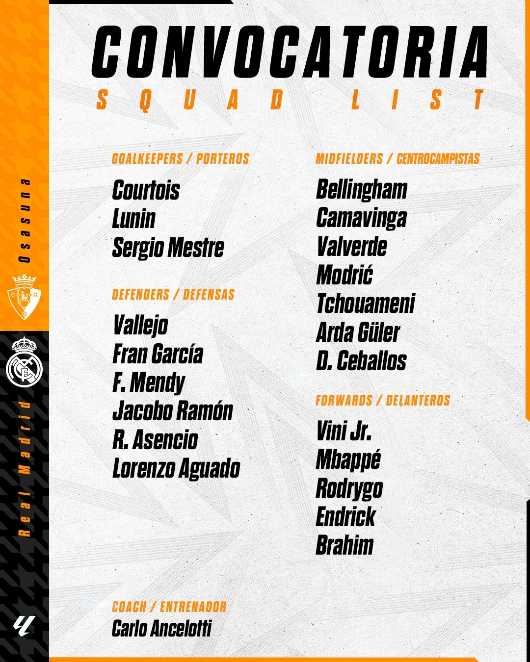 2月15日訊 在本輪西甲聯(lián)賽的一場(chǎng)比賽中,皇馬將赴客場(chǎng)對(duì)陣奧薩蘇納,賽前,皇馬公布了本場(chǎng)比賽的球員大名單,如下: